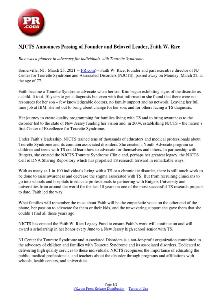 NJ CENTER FOR TOURETTE SYNDROME ASSOCIATED DISORDERS INC. The New Jersey Center for Tourette Syndrome NJCTS is a not-for-profit organization committed to the advocacy of children and families with Tourette Syndrome and its. A n d A s s o c i a t e d D i s o r d e r s I n c. 50 Division Street Suite 205 Somerville NJ 08876 phone. NJ Center for Tourette Syndrome Somerville NJ. NJ CENTER FOR TOURETTE SYNDROME ASSOCIATED DISORDERS INC. NJCTS provides referrals for medical diagnosis treatment and psychological services. Classification Public Health Program Includes General Health and Wellness Promotion Services Health General and Rehabilitative Nonprofit Tax Code. While there is consistent evidence that genetic factors play a significant etiologic role no replicable susceptibility alleles have thus far been identifiedDescriptionHere we discuss a sharing resource of clinical and genetic data the New Jersey Center for Tourette Syndrome Sharing Repository whose goal is to provide clinical data DNA and lymphoblastoid cell lines to qualified.