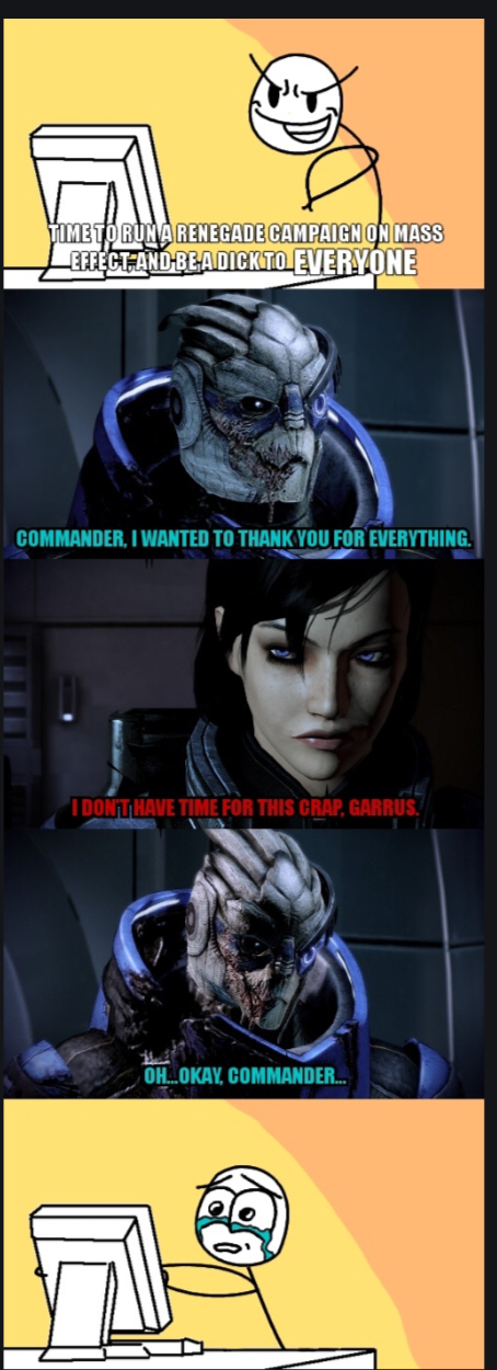 In the Citadel DLC for Mass Effect 3 Shepard tells hisher space hamster to Go for the eyes after the Normandy is hijacked. When autocomplete results are available use up and down arrows to review and enter to select. For Mass Effect 3 on the Xbox 360 a GameFAQs message board topic titled Create a mass effect 3 meme - Page 2. Meme Bioware Trying To Pick A Canon Ending For Mass Effect 4 Youtubehaiku. Suffice to say the fourth installment sounds ambitious man. Finally finished this massive ME3 meme of madness. Knights of the Old Republic. Through additional cinematic sequences and epilogue scenes the Extended Cut will give fans seeking further clarity to the ending of Mass Effect 3 deeper insights into how their personal journey concludes. Mass Effect 3.