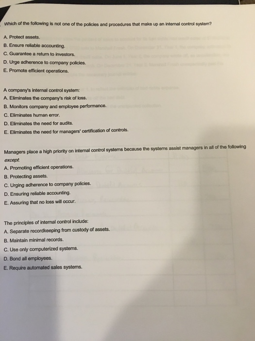 A good system of internal control will include all of the following except. Making all major payments by check. Principles of internal control include all of the following except. 1 Management personnel should have high integrity and ethical values and be committed to diligently performing key internal control procedures.