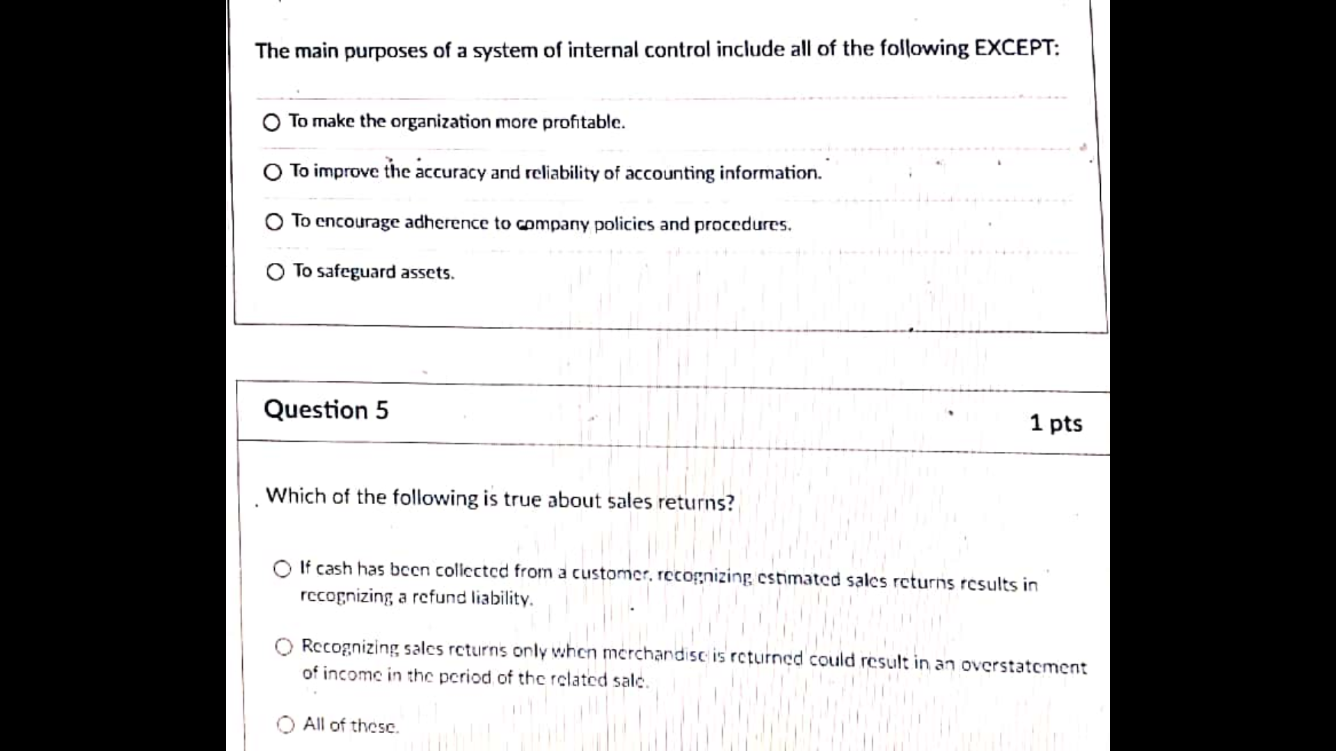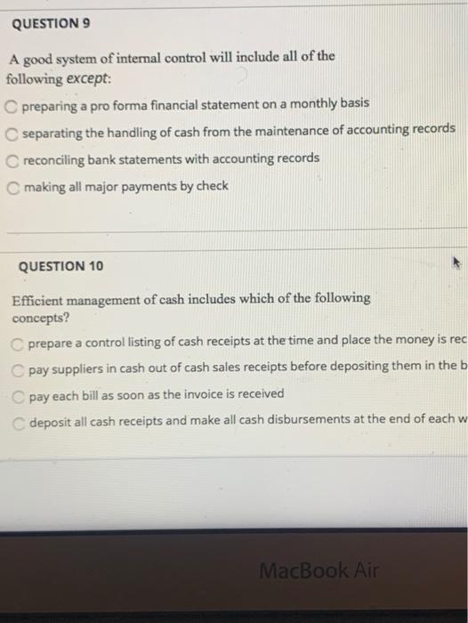 For good internal control the purchasing department should not be responsible for a Authorizing the acquisition of goods b Finding the lowest cost vendor c Reviewing the vendors catalog descriptions and prices for standardized items d Designing the purchase. For each client you need to understand each component in order to effectively plan your audit. Week 5 Exam Question 1 1 1 point A good system of internal control will include all of the following except.