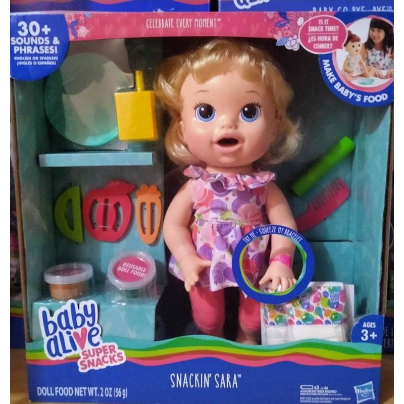 43 out of 5 stars. What does baby alive Snackin Sara do. This Baby Alive Super Snacks Snackin Sara doll has a lot of features and accessories. Use only Baby Alive reusable doll food with this Baby Alive doll. She needs lots of cuddles and care. She Makes Mealtime Just as Fun as Playtime Snackin Sara is an adorable baby with a big appetite. You can feed Sara by using the reusable doll food and sha. Includes doll removable outfit 2 diapers 2 one-ounce containers of reusable doll food 2 shaping tools roller plate pretend juice box comb and instructions. Use the included shaping tools to create various kinds of meals to feed to the Baby Alive talking doll.